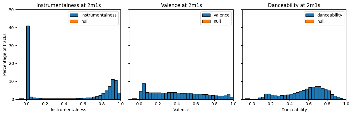 We notice in each case a ~2% proportion of tracks where the feature is null, which we interpret as a failure of the feature-computing algorithm on those tracks, i.e. ill-defined features for the tracks.