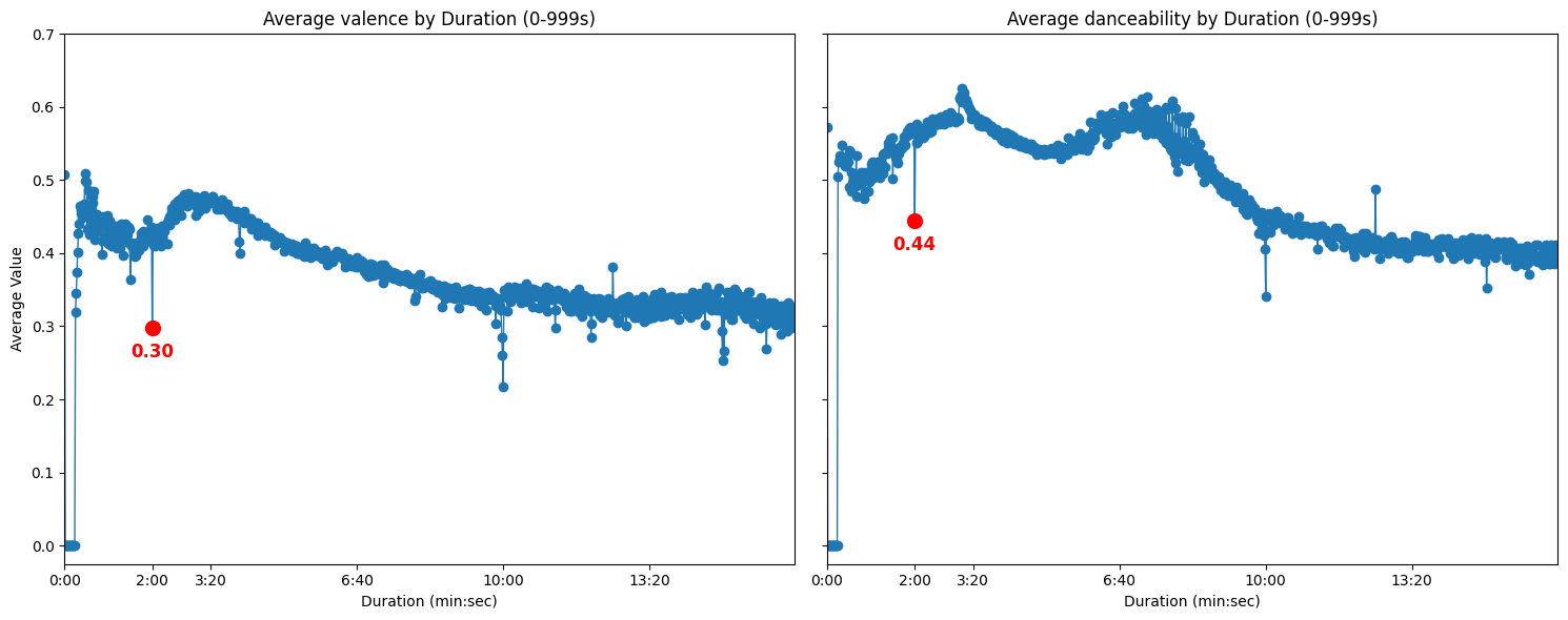 This strongly suggests that a differentiating factor of the 2m peak from neighbouring durations is an increased presence of high-instrumentalness, low-valence, low-danceability tracks which typically correspond to functional music (sleep/relaxation) or background/lo-fi.