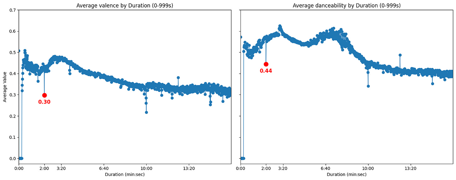 We see a sharp rise at the 2m mark. For valence and danceability we see a sharp decrease: