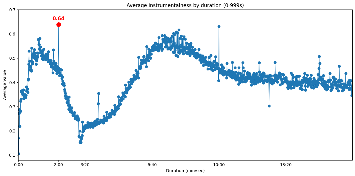 Let’s look at instrumentalness, averaged among all tracks of the same duration: