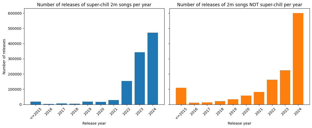 As we can see, contrarily to super-chill tracks, non-super-chill tracks have seen a sudden surge in 2024, which strongly suggests that something changed in 2024, allowing for the mass production of songs — assuming that non-super-chill tracks are more like typical songs.
