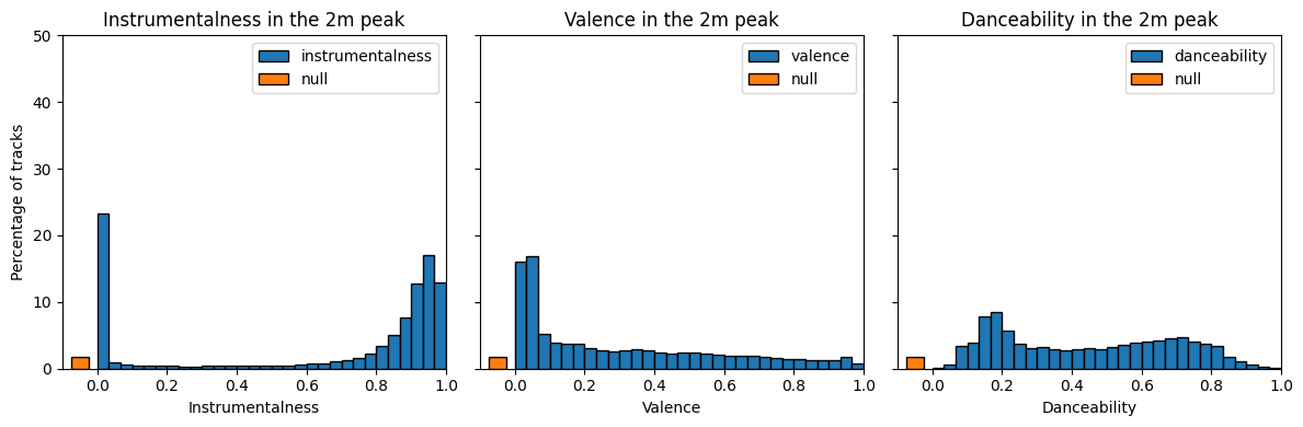 Let’s look at the distributions of instrumentalness/valence and danceability in the 2m peak: