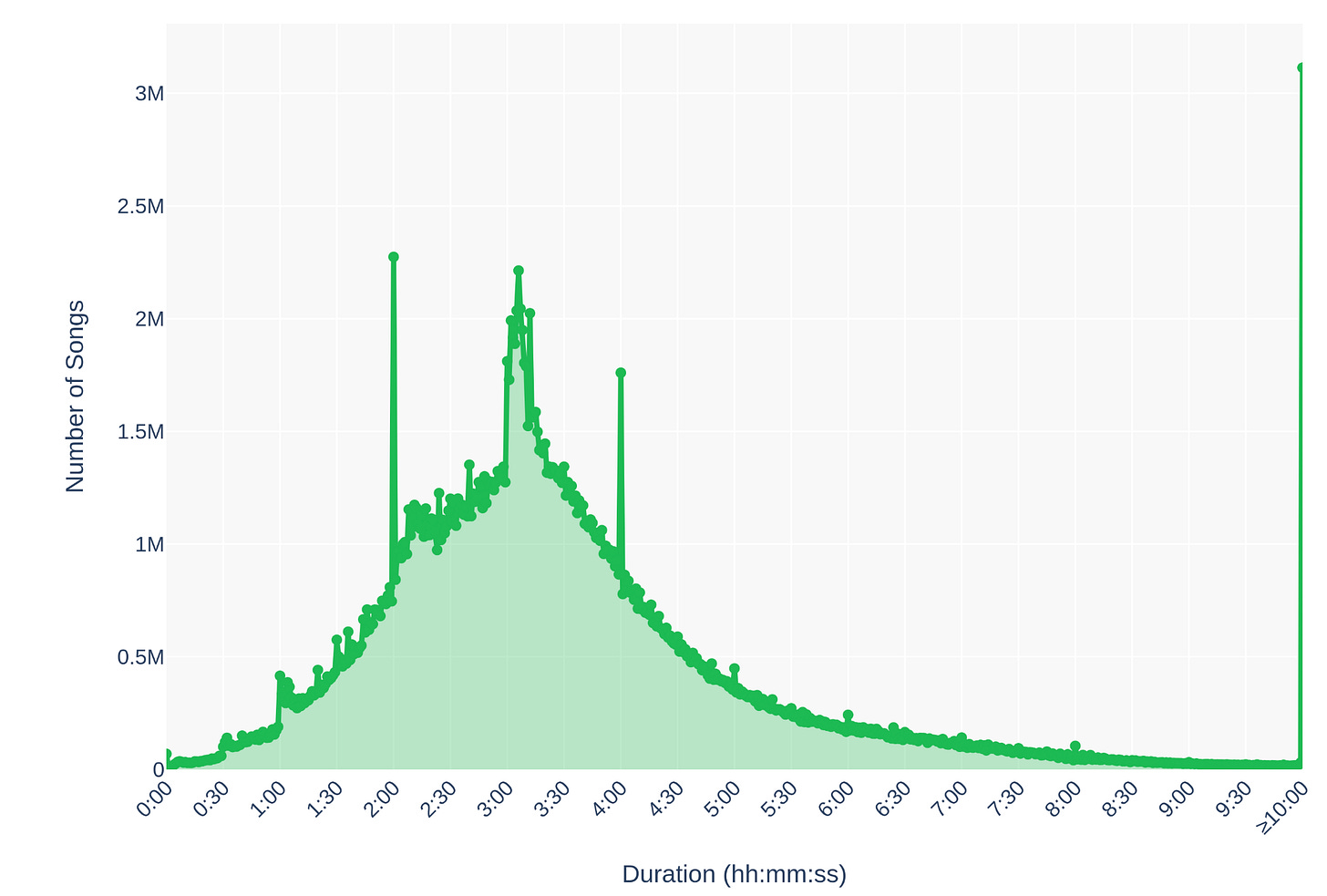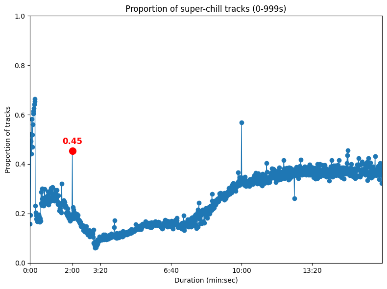 Hence, it is clear that the 2m peak contains an abnormally high amount of super-chill tracks, which we define to be tracks with > 0.5 instrumentalness (or null), < 0.5 valence (or null), and < 0.5 danceability (or null).