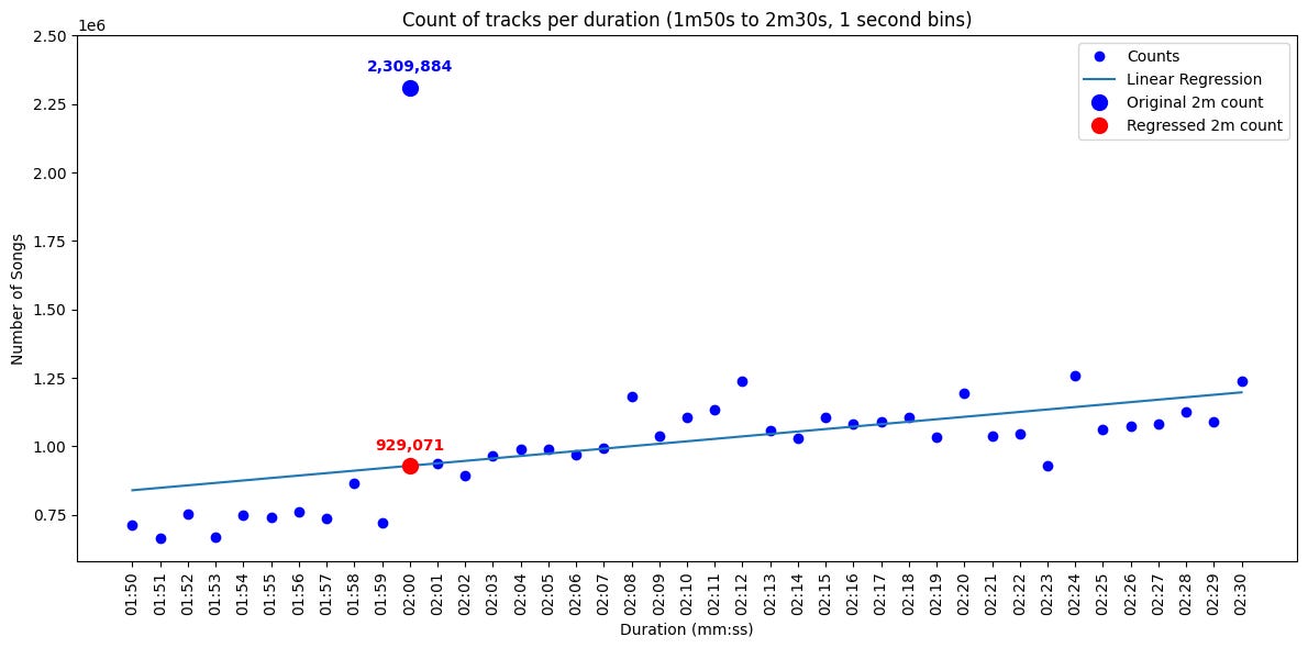 Using a linear regression, we see that the 2m peak contains an abnormal excess of about 1.3M songs! Where do they come from?